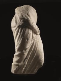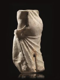 Frammento di torso in marmo greco a grandi cristalli riferibile a una figura femminile che poggia il suo peso sulla gamba destra mentre piega la sinistra in avanti. La donna è nuda nel tratto superiore del corpo, almeno fino all’ombelico, mentre le gambe sono coperte da un articolato panneggio che si arrotola sui fianchi. H. max. 60 cm.