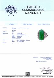 diamanti taglio brillante, huit huit e baguette per ct 1.10, sulla sommità una spola in giada, punzone PT, mis. 7, g 15. Corredato di certificato I.G.N del 11/09/2019 attestante le caratteristiche.