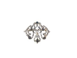 in oro 9kt e argento, una spilla a barretta con diamante taglio vecchio di ct 0.30 circa, lungh. cm 5,50 e una spilla a tralci con zaffiri taglio rotondo e a goccia per ct 1.70 circa, dim. 45x35 mm, gr 12 circa complessivi