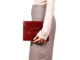 in pelle box bordeaux, impunture rosse, da portare a mano con chiusura con patta. Fodera interna in pelle rossa, una sottile tasca chiusa con bottone a pressione e una tasca applicata. Corredata di sacchetto originale.