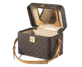 in tela Monogram su base rigida con chiusura in metallo dorato e tracolla regolabile. Interno in pelle con tre spazi per bottigliette cosmetici e specchio estraibile dim. cm 19x14. Dim. porta cosmetici cm 32x21x20