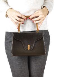 in pelle spazzolata testa di moro, con chiusura e manico effetto bachelite. Corredata di sacchetto in panno rosso.
