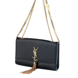 in vitello nero, con catena in ottone, chiusura a calamita con logo e nappa in ottone.