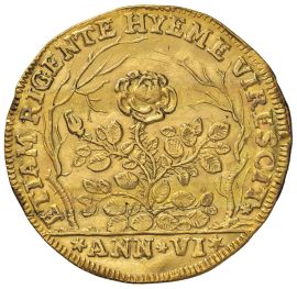 Au gr. 13,75 D/ S. Marco in trono porge il vessillo al Doge genuflesso; es. B C 2° (Benedetto Civran) R/ Rosa fiorita con foglie e spine; es. ANN VI Mont. 2284 Paol. 358