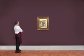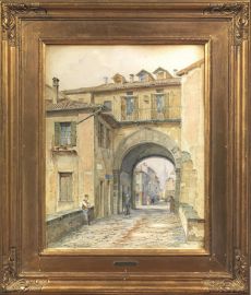 on the reverse: label inscribed: "La pusterla dei fabbri rappresentati dal lato prospicente il / ponte sul Naviglio del primo tratto ... / presso a la via di San Vincenzo la via / che si scorge al di là del portone è la via / di San Simone poi il Carrobbi. Il mio primo / schizzo lo compi a sedici anni (applaudito / da tutto il vicinato, Via Torchio 1) ed è quello / di cui mi sono poi più tardi per altri studi servito / e per questo acquerello esposto al "giardino" 1932 X / Vecchia Milano / Arturo Ferrari"