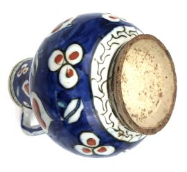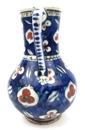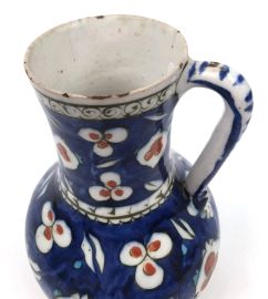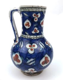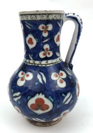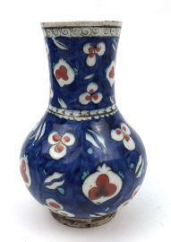 in ceramica invetriata, corpo globulare con alto collo cilindrico, un’ansa ricurva scende dal collo verso la parte aggettante del corpo. L’opera è interamente decorata in blu cobalto sottovetrina, turchese e rosso a rilievo con sottili linee di demarcazione in manganese, a sottolineare alcune riserve che comprendono un ornato semplice e schematico a piccole sfere accostate secondo il motivo çintemani, simbolo di potere e abbondanza. Il manganese sottolinea le forme del vaso all’orlo, alla strozzatura del collo e sul piede con sottili motivi minori. Il motivo decorativo deriva dagli esemplari dello stile floreale compreso tra XVI e XVII secolo, ma la corrività dell’esecuzione e l’assenza di elementi in verde porta a datare l’esemplare al 1600 circa; alt. cm 20,6, diam. bocca cm 7,8, diam. piede cm 8