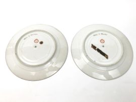 in porcellana dipinta in policromia e oro, raffigurante al centro del cavetto rispettivamente paesaggi con castello di Chenonceaux e castello di Chambrai, figure e personaggi; la tesa dipinta in blu con decori in oro a rilievo. Il servizio trae ispirazione dal più noto servizio di piccole vedute della Francia ordinato dal re Luigi Filippo per il castello delle Tuileries dal 1832, con supplementi forniti regolarmente ogni anno: Sul retro di entrambi i piatti descrizione del soggetto e marche della manifattura; diam. cm 24,8