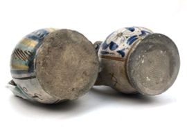 in maiolica dipinta in blu, verde rame, giallo antimonio; corpo ovoidale poggiante su una base piana a profilo appena estroflesso, bocca tribolata, ansa a nastro impostata sotto l’orlo che scende al ventre, nel punto di massima espansione. Un boccale presenta sul fronte un medaglione a fondo giallo entro il quale è raffigurato un casale, contornato sul resto della superficie da un decoro a palmetta persiana; l’altro, di forma analoga, presenta un decoro a bande parallele di colori differenti con decoro a piccoli trattini obliqui; alt. cm 18 e 18,2
