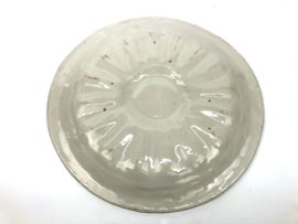 in maiolica bianca; il cavetto concavo appena umbonato è circondato da una fascia a rilievo, la balza mostra un motivo a baccellature a raggera mentre la tesa mostra un decoro a rilievo con una catena di ovuli concentrici. La superficie è lasciata bianca priva di decorazione, secondo l’uso del periodo compendiario, a lasciare in evidenza la forma mutuata dai bacili metallici; diam. cm 47,4