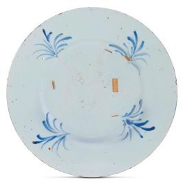 in maiolica, cavetto profondo e larga tesa obliqua, fondo piano privo di cercine. Il decoro in monocromia blu su fondo maiolicato azzurro “latesino” ripropone un tipico decoro ligure cosiddetto “a tappezzeria”, centrato dall’immagine di un uccello rapace gradiente. Al verso quattro rametti fogliati stilizzati. Questo esemplare è tipico delle manifatture pavesi dell’inizio del secolo XVIII e presenta numerosi riscontri in collezioni pubbliche e private; diam. cm 38,6