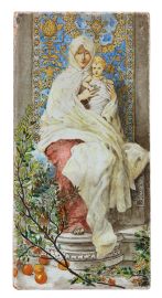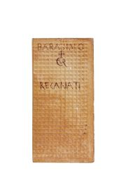 in ceramica terracotta smaltata e dipinta in policromia raffigurante Madonna col Bambino in trono. Iscritta su retro BARABINO/monogramma/RECANATI; cm 20x10. Entro cornice in legno dorato