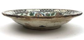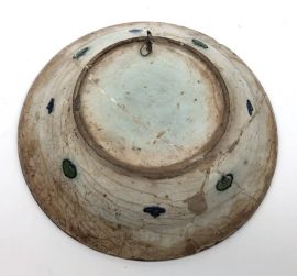 in ceramica invetriata policroma. Bacile a orlo liscio, tesa obliqua e cavetto concavo ribassato al centro. Il decoro si basa su una disposizione simmetrica di elementi floreali centrati da una foglia lanceolata circondata da boccioli di tulipani rossi e blu e garofani rosso pomodoro. Del tutto simile ad altri piatti presentati in questo catalogo, il piatto mostra una tesa dipinta con il consueto motivo “ad onde e scogli” o “rocce in stile cinese”; diam. cm 25,8, diam. piede cm 13,5, alt. cm 5,5