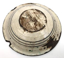 in maiolica dipinta in policromia, raffigurante contadina con abito a righe e grembiule arancio, che porta sul capo un cesto di frutta e con entrambe le braccia dei cestini con verdure. Le caratteristiche stilistiche sono affini al gruppo del “pittore Geometrizzante”. Smaltato sul retro con decoro a righe concentriche di manganese; diam. cm 32,5