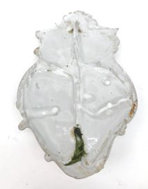 in porcellana bianca di forma sagomata con decori a rilievo, cartella parietale centrata da raffigurazione della Madonna con Gesù bambino in braccio e contornata da decori rocaille che dai fianchi salgono sinuosamente verso la cimasa centrale; un decoro a rilievo si trova anche sulla vaschetta posta nella parte inferiore, quasi ad imitare le onde dell’acqua. Di questa tipologia di oggetti si parla spesso negli inventari della Manifattura, ed è interessante ricordare che nel 1757 viene citata “N. 1 Piletta bianca da acquasanta rappresentante la Vergine, e Gesù Bambino”; cm 21,5x13,5x4,5