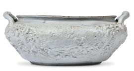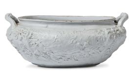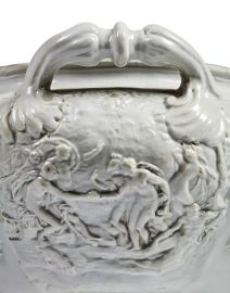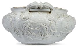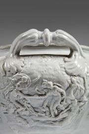 in porcellana bianca decorata a bassorilievo istoriato. La zuppiera, priva del coperchio, ha forma ovale, con costolature architettoniche a definire i riparti dedicati alle scene istoriate a bassorilievo, che ricoprono l’intera superficie; le anse sono a staffa, portate alte. Questo modello, qui acromo e probabilmente ascrivibile al primo periodo della produzione, riproduce a bassorilievo alcuni dei soggetti spesso utilizzati dalla manifattura, che traggono spunto da un gruppo di sedici placche realizzate da Guglielmo della Porta tratte dalle Metamorfosi di Ovidio. I modelli di queste opere furono realizzati da alcuni artisti presenti in manifattura nel corso del 1745 e poi tramutati in gesso. Si distinguono nei lati principali della zuppiera: La caduta dei Giganti da Guglielmo della Porta e La Morte di Niobe e i suoi figli da un disegno di Bernard Picard, mentre sotto i manici Marsia scorticato da Apollo. Una coppia di zuppiere policrome molto vicina alla nostra è conservata al Museo di Capodimonte, a conferma di come la porcellana con scene in bassorilievo in passato fosse sempre stata attribuita alla fabbrica napoletana. Pochi comunque gli altri esemplari noti realizzati con questa tecnica, che viene ricordata in archivio Ginori per la prima volta nel marzo del 1745; nei documenti, tra l’altro, il Marchese fa inoltre riferimento ad un problema tecnico di cottura, riparabile, che non ne avrebbe comunque compromesso la bella resa finale; cm 13,6x32x25,5