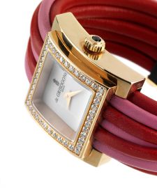 cassa di forma rettangolare in oro rosa 18kt, quadrante bianco firmato “de Grisogono”, ghiera con brillanti, movimento al quarzo, cinturino integrato in pelle a vari fili intrecciati di colore rosso e rosa, diam. interno cm 6, gr. 100 circa. Corredato di sacchetto in pelle, scatola, garanzia e cartellino. Dim. mm 33x33