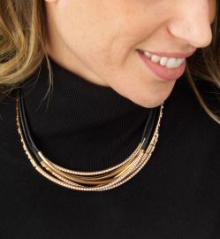 DE GRISOGONO “ALLEGRA” SEMIRIGID DIAMOND NECKLACE IN BLACK LEATHER AND 18KT YELLOW GOLD