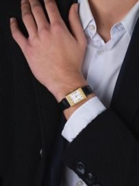 cassa in oro giallo 18kt, fondello a scatto, quadrante bianco, numeri romani, movimento a carica manuale cal. 625, cinturino in pelle, fibbia placcata oro, vetro minerale. Dim. mm 31x23