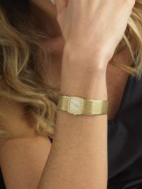 cassa in oro giallo 18kt, quadrante oro, indici applicati, movimento a carica manuale, bracciale integrato in oro giallo 18kt, lungh. cm 18, vetro plastica, gr. 60