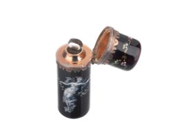 rivestito in lacca nera e decorato in smalti policromi con raffigurata una leggiadra fanciulla fra tralci fioriti, dim. cm 6x2x2, gr. 37