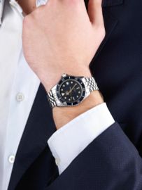 cassa a vite in acciaio, ghiera girevole unidirezionale, corona a vite, quadrante nero, grafica oro, movimento al quarzo cal. ETA 2.91, datario a ore 3, impermeabile 200 metri, bracciale in acciaio con allungamento per muta e chiusura di sicurezza, vetro minerale. Corredato di scatola service. Diam. mm 37