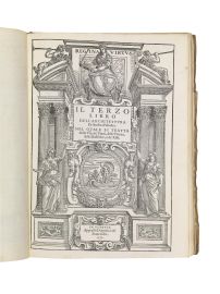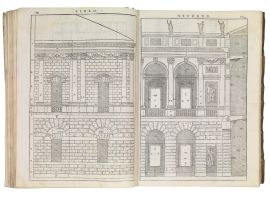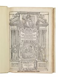 BELLISSIMO ESEMPLARE DI QUESTA PRIMA EDIZIONE COLLETTIVA DI UNO DEI PIÙ IMPORTANTI TESTI DI ARCHITETTURA. L’opera è suddivisa in quattro libri che trattano argomenti diversi. Il primo, dedicato all’amico Giacomo Angarano, analizza “la scelta dei materiali, le tecniche costruttive, le forme degli ordini architettonici di tipo Tuscanico, Dorico, Ionico, Corinzio e Ordine composito in tutte le loro parti (basamenti, colonne, architravi, arcate, capitelli, trabeazioni), illustrati in una serie di tavole ed infine gli altri elementi edilizi (soffitti a volta, pavimenti, porte e finestre, camini, coperture e scale). Il secondo libro riporta una serie di progetti architettonici di Andrea Palladio, di cui 9 palazzi signorili di città, 22 ville signorili (di cui 13 completate secondo il progetto, 5 realizzate in parte e 4 incompiute) ed una serie di progetti palladiani di costruzioni non realizzate. […] Il terzo libro, dedicato a Emanuele Filiberto di Savoia, descrive la maniera di costruire le strade rettilinee lastricate in pietra, i ponti in legno ed in pietra con numerosi progetti palladiani, le piazze antiche realizzate dai greci e dai latini ed infine le basiliche fra cui la basilica progettata da Vitruvio a Fano e l'importante Basilica Palladiana di Vicenza. Il quarto libro contiene i rilievi di 26 edifici romani antichi fra cui 18 templi a pianta rettangolare dei fori repubblicano e imperiale di Roma antica, Napoli, Spoleto, Assisi, Pola e Nimes, una basilica romana a pianta rettangolare, 7 templi o Basiliche a pianta centrale a Roma e dintorni. […] Thomas Jefferson, presidente degli Stati Uniti d’America e uno dei più fervidi estimatori di Palladio, una volta si riferì a questo testo definendolo “la Bibbia” dell’architettura. Jefferson possedeva cinque diverse edizioni del testo e progettò la propria residenza di Monticello in stile neopalladiano. “Palladio’s lasting influence on architectural style in many parts of the world was exercised less through his actual buildings than through his textbook.” (PMM 92).