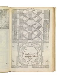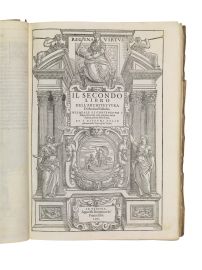 In folio (304 x 204 mm). 67 [1], 78 [2], 46 [2], 133 [3] pp. Frontespizio architettonico xilografico ripetuto all’inizio di ognuno dei quattro libri, numerosissime illustrazioni xilografiche nel testo, iniziali xilografiche. Pergamena rigida moderna con titolo manoscritto al dorso. Antiche note di possesso al frontespizio e alla carta I3 (p. 65 del primo libro), antiche postille di studioso (una con piccolo schizzo), ultima carta impercettibilmente restaurata e altre trascurabili tracce del tempo, ma nel complesso copia molto ben conservata.