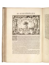 In folio (328 x 224 mm). [vi] 161 [1] cc. Assente la carta 2h4 (123) e, come in tutti gli esemplari, 2Q4 (tolta all’origine dal tipografo perché doppia). Frontespizio con ampia cornice architettonica calcografica. A l4r calcografia a piena pagina con le armi di Filippo II di Spagna. Al verso di m2 insegna dell’Accademia degli Affidati. [113] calcografie (assente quella a 123v) rappresentanti le imprese dei membri dell’Accademia. Marca tipografica in fine. Iniziali xilografiche. Piena pergamena coeva con unghiatura. Frontespizio polveroso con pallide macchie, restauri integrativi e ablazione dell’angolo basso senza perdite, ablazione di un pezzo del margine basso di carta l4r che non intacca la calcografia, qualche strappo e restauro marginale.