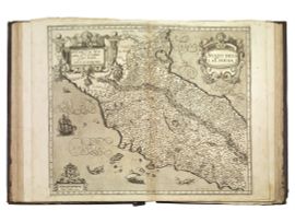 RARISSIMA PRIMA EDIZIONE DEL PRIMO ATLANTE A STAMPA DELL’ITALIA, IL CAPOLAVORO DI MAGINI, che rimase per buona parte del XVII secolo l’opera di riferimento per la geografia del nostro paese. Le 61 mappe illustrano l’Italia intera, lo stato del Piemonte, la signoria di Vercelli, il ducato del Monferrato, la Liguria e le riviere, la Corsica, lo stato di Milano, il ducato di Milano e i suoi territori (laghi ecc.), i ducati di Mantova, Modena, Parma e Piacenza, il dominio Veneto, i territori di Bergamo, Brescia, Crema, Verona, Vicenza, Padova, Rovigo, Feltre, Cadore, Istria, Trento, ecc., lo stato della Chiesa e il ducato di Toscana, i ducati di Urbino e Ferrara, Bologna, la Romagna, la Marca d’Ancona, i territori di Perugia e Orvieto, Umbria, Lazio, dominio fiorentino, stato di Siena, isola d’Elba, Lucca, regno di Napoli, Abruzzo, Molise, Bari, Basilicata, Otranto, ecc., Calabria citra e ultra, Ischia, Sardegna e Sicilia. “ […] il lavoro massimo, cui Magini dedicò gran parte delle sue fatiche nell’ultimo ventennio della sua vita, fu un Atlante d’Italia, per il quale volle preparare carte in gran parte originali, delineate cioè in base a rilievi ufficiali fatti eseguire dai vari governi italiani e che egli riuscì a procurarsi per il benevolo interessamento dei Gonzaga. Il lavoro di raccolta, di coordinazione, di revisione e di disegno e incisione (onde ebbe necessità di mantenere presso di sé abili incisori specializzati) fu lunghissimo e arduo; […] la stampa era appena avviata quando Magini morì. Esso fu pertanto pubblicato postumo dal figlio Fabio nel 1620 col titolo Italia di Gio. Ant. Magini data in luce da Fabio suo figliuolo (Bologna 1620; ristampe dei 1632 e 1642); consta di 61 tavole e di un breve commentario geografico. […] Le carte d’Italia esercitarono un’influenza immensa: furono ricopiate, contraffatte, imitate, moltissime volte in Italia e all’estero; entrarono, senza modificazioni, a far parte di atlanti stranieri notissimi, come quelli di Jodocus Hondius e di Joan Blaeu; in Italia rimasero monumento insuperato per oltre un secolo.” (Wikipedia). Tutte le mappe sono straordinariamente dettagliate; quelle con le isole e tratti di mare hanno anche affascinanti vascelli e creature marine tra i flutti.