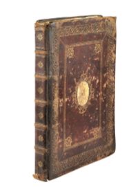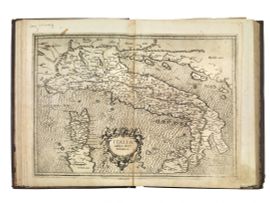 In folio (397 x 274 mm). [viii] 24 pp. seguite da [61] tavole calcografiche. Frontespizio calcografico in cornice xilografica inciso da Oliviero Gatti, colophon a carta [croce greca]4v. Iniziali e fregi xilografici. Piena pelle coeva decorata in oro ai piatti e al dorso, tagli spruzzati di rosso. Decorazione (armi?) ovali al centro dei piatti asportate, cuffie sciupate, abrasioni e sbucciature; le pagine di testo presentano tracce d’uso (strappetti e pallide ditate ai margini, pallida macchia al margine interno delle prime carte); le tavole presentano anch’esse tracce d’uso (strappetti e pallide ditate marginali, sgualciture), un paio hanno i margini un po’ rifilati e antichi restauri al verso, le mappe della Liguria, del territorio di Vicenza, del Dominio fiorentino, e del Regno di Napoli hanno strappi leggermente più lunghi, le ultime tavole presentano una pallidissima gora al margine interno, ma nel complesso esemplare genuino e con le mappe in freschissima impressione.