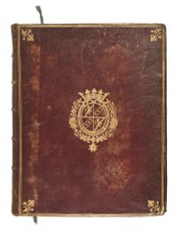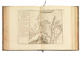 3 volumi in 4to grande (280 x 217 mm). [iv] xvi 526 [2] pp., [1] carta di tav.; [iv] 524 [4] pp.; [iv] 8 [8] pp., 45 tavole calcografiche a doppia pagina e ripiegate. Grande ritratto calcografico del Conte de Saxe all’antiporta del primo volume, al frontespizio stemma xilografico del Re di Francia. Al terzo volume 45 tavole calcografiche raffiguranti mappe di città, di battaglie e schieramenti bellici. Marocchino rosso coevo alle armi di nobile non identificato, piatti riquadrati da triplo filetto dorato con decorazione floreale agli angoli, dorso nervo con titoli e decorazioni dorate, unghia e dentelles dorate, sguardie marmorizzate, tagli dorati. Legature con tracce d’usura ai piatti (più forti al piatto anteriore del terzo volume), abrasioni ai dorsi, angoli sbucciati, occasionali fioriture, ma carte di tavole molto ben conservate.