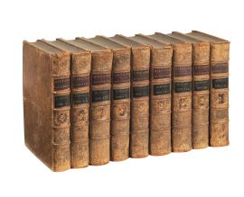 9 volumi in 4to (252 x 188 mm). Vignetta con armi di Francia incisa in rame ad ogni frontespizio e una graziosa testatina in rame all’inizio di ogni volume. Vol. 1: [vi] xxiv 496 pp. e 29 tavole calcografiche. Vol. 2: [viii] 560 pp. e 27 tavole calcografiche. Vol. 3: [ii] iv [12] 502 xcvi [2] pp. e 31 tavole calcografiche. Vol. 4: xvi 590 xxviii [2] pp. e 27 tavole calcografiche. Vol. 5: xv [i] 546 xxviii [2] pp. e 22 tavole calcografiche. Vol. 6: xvi 702 [2] pp. e 25 tavole calcografiche. Vol. 7: [ii] xvi 554 xcvi [2] pp. e 31 tavole calcografiche. Vol. 8: [ii] viii 498 xlii pp. e 39 tavole calcografiche. Vol. 9: viii 438 xxx 284 pp. e 31 tavole calcografiche. Vitellino biondo coevo con doppio tassello bordeaux e nero al dorso, scomparti decorati in oro, sguardie marmorizzate, tagli gialli. Legature un po’ sciupate, soprattutto ai dorsi e alle estremità, tavole con timbro della Medical Society di Edinburgh, primo volume con macchie d’inchiostro e vari interventi di mano infantile (pp. 35, 55, 107, 298/299, 300, 334, 341), pallide fioriture e bruniture occasionali, assenti tutti gli occhielli con il titolo collettivo.