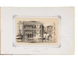 Primo volume di questa monumentale opera dedicata a Venezia, con testo in italiano di Gianjacopo Fontana e in francese di Leopold Crilanovich. Le tavole sono disegnate da Marco Moro, che come sottolinea Fontana nella prefazione, “ritrasse dal vero i suoi spiritosi disegni”. Si tratta in effetti di illustrazioni che colgono molto bene lo spirto dei palazzi di Venezia, con tutti i loro dettagli architettonici, per lo più immersi nella Laguna con gondole e altre imbarcazioni in primo piano, ma anche per le calli di Venezia, animate da personaggi con i costumi dell’epoca.