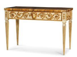 in legno laccato e dorato, piano di forma rettangolare lastronato in marmo giallo, fascia sottopiano ornata a fregi vegetali a inquadrare al centro volto femminile con corona di fiori, fregi vegetali agli angoli da cui si dipartono le gambe troncopiramidali scanalate, cm 95x140x63,7