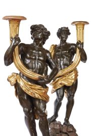 in legno intagliato laccato e dorato, raffigurati in posizione stante su base rocciosa in atto di tenere una cornucopia, il corpo nudo coperto solo da un panneggio cinto ai fianchi, alt. cm 162 e cm 159