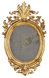 di forma ovale in legno intagliato e dorato, battuta liscia su fascia modanata con bordo aggettante che scende a muro con gole lisce, alla quale si applica in alto e in basso ricco fregio a giorno con foglie aperte ai centri tra volute fogliacee che si portano sui lati, cm 76x48