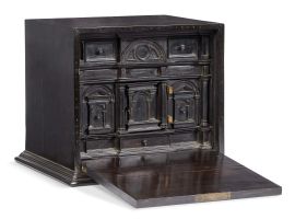 in legno lastronato in ebano, fronte a ribalta celante struttura architettonica a uno sportello centrale tra colonne a tutto sesto inquadrato ai lati da due cassetti in foggia di portali con timpano e sormontato da cassettino intagliato a timpano ad arco tra due cassetti profilati da cornice modanata ai lati, fascia inferiore a un cassetto di forma scantonata profilato in basso da cornice modanata, cm 26x31,2x26