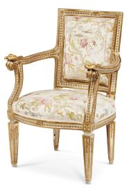 in legno intagliato laccato e dorato, seduta e schienale rivestiti in tessuto ornato a rabeschi fioriti, cartella rettangolare profilata da fiocco al centro superiore da cui si diparte motivo perlinato continuo che prosegue sui sostegni di linea lievemente mossa e terminanti a ricciolo, sul quale poggia un piccolo volatile, grembiale mosso ornato analogamente alla cartella su gambe troncopiramidali intagliate a festoni che si dipartono da dadi angolari centrati da fiore, cm 89,5x62x55