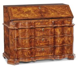 in noce e radica di noce, fronte a ribalta celante sportello centrale tra quattro cassettini di linea mossa disposti su due colonne, cui seguono tre cassetti mossi di linea spezzata, fianchi, tutta la superficie ornata da riserve filettate a inquadrare specchiature in radica, base modanata su piedi a mensola, cm 101x132x65