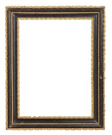 in legno ebanizzato e laccato, battuta rilevata intagliata a foglie e mezze foglie ricorrenti su ampia gola che con bordino a nastro ritorto risale su profilo aggettante che scende a muro con bordo a foglie e mezze foglie; ingombro cm 131x105, luce cm 101,5x75,5