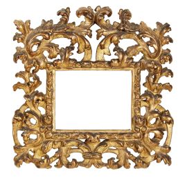 in legno intagliato e dorato, battuta liscia su profilo bombato intagliato a fogliette ricorrenti che si dipartono dai centri, segnati da nodi, per portarsi verso gli angoli, al quale si applica la fascia traforata a giorno scolpita a motivo di ricche volute fogliacee che dal centro inferiore, dove sono trattenute da nastro, si portano simmetricamente sui lati per andare a convergere al centro superiore nell’ampia cimasa; ingombro cm 38x38, luce cm 14x17,8