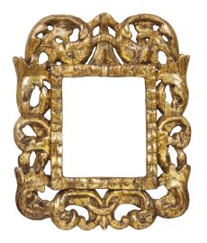 in legno intagliato e dorato a mecca, battuta rilevata a fogliette ricorrenti che dai centri, segnati da nodi, si portano agli angoli, al quale si applica la fascia scolpita a giorno a motivo di volute ricorrenti che dal centro inferiore, dove sono trattenute da nodi, si portano simmetricamente al centro superiore; ingombro cm 36x30, luce cm 16,4x13,5