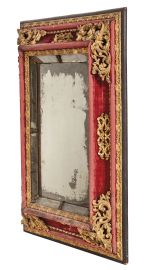 in legno intagliato dorato e rivestito in velluto rosso, battuta a foglie e mezze foglie seguita da sagoma aggettante che discende su gola profilata esternamente da motivo a nastro ritorto e ornata agli angoli e ai centri da grandi rabeschi fogliacei trattenuti da nastri, bordo a foglie e mezze foglie si porta a muro, montata a specchio; ingombro cm 120x100, luce cm 78x59