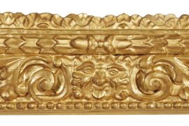 in legno intagliato e dorato, battuta liscia con controbattuta perlinata risale su sagoma a volute fogliacee ricorrenti intervallate al centro di ogni lato da mascherone e agli angoli da scudo coronato, cui segue bordo con fogliette sovrapposte e ricorrenti che dai centri confluiscono verso gli angoli, profilo a foglie e mezze foglie scende a muro; ingombro cm 92,5x83,5, luce cm 55x46,5