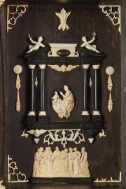 in legno ebanizzato e osso, di forma architettonica con basamento modanato centrato da medaglione tra volute su cui poggiano due semicolonne laterali affiancate da volute a sostenere architrave con incisa la frase QUEM GENUIT ADORAVIT sormontato da timpano sagomato, a inquadrare al centro teca in vetro con scena di adorazione del Bambino entro quinta architettonica formata da colonne che sostengono timpano triangolare sormontato da due putti e sottesa da fregio con Gesù tra gli Apostoli, cm 66,5x44x16