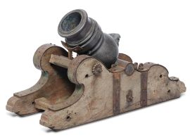 in bronzo, ruotabile in direzione longitudinale, inserito su supporto di legno dal profilo mistilineo con montatura in metallo; sulla canna è intagliato un mascherone, mentre sulla bocca da fuoco di forma modanata vi è l’iscrizione “MODENA”; cm 23,5x38,5x14