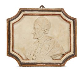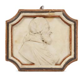 altorilievi in marmo di forma quadrangolare ad angoli scantonati profilati da cornice a piccole modanature dipinte, raffiguranti Alessandro VI, Paolo III, Innocenzo XII e Clemente XI, cm 20,7x24,2