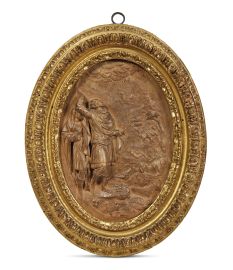 altorilievi ovali in terracotta, cm 22,4x16,2, entro cornici in legno intagliato e dorato con battuta sagomata a fogliette cui segue gola liscia che risale su bordo aggettante ornato da unghiature, cm 31,3x24,5