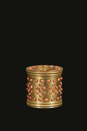in rame dorato con decori in corallo, di forma cilindrica con borchiatura semplice a creare un decoro stilizzato che torna sul coperchio, alt. cm 6, diam. cm 6