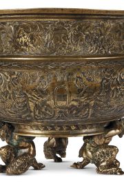 in bronzo di forma circolare, corpo bombato ornato al centro da stemma entro cartiglio trattenuto da puttini da cui si dipartono volute fogliacee ricongiunte nel retro da personaggio mitologico, segue fascia decorata a fogliette ricorrenti che si porta sul collo di linea svasata ornato con green man centrale dalla cui bocca si dipartono motivi vegetali abitati da nidi di uccellini e serpenti, su quattro piedi a forma di satiri inginocchiati non pertinenti, cm 22x28x30